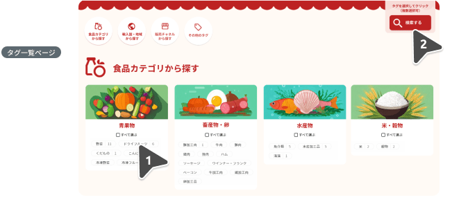 タグ一覧ページが表示されたら、ご希望の商品に合うタグを選び(複数選択可)、右上の検索するボタンをクリックしてください。